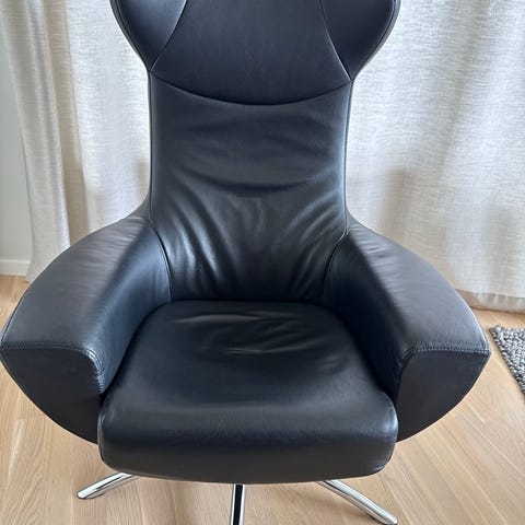 Conform timeout lenestol i sort skinn med sort tre på sidene og under, samt fot i krom med sving. Stolen har justerbar ryggstøtte og regulerbar hodestøtte. Krom håndtak på høyre side som regulerer ryggen sømløst.