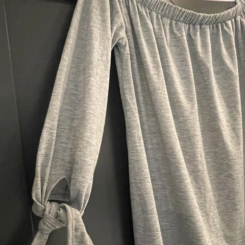 Bølget passform, off-shoulder design med en klebrig søm i gummi på innsiden (sklir ikke av), volangdetaljer/rysjer på halslinjen, elastisk midje og en volangdetalj på den nederste linningen. Fin pastellgrønn farge med hvite blomster/blader.