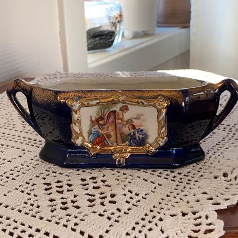 Jardiniere 29,5 cm med håndtak x 15 cm . Høyde 8,5 cm .