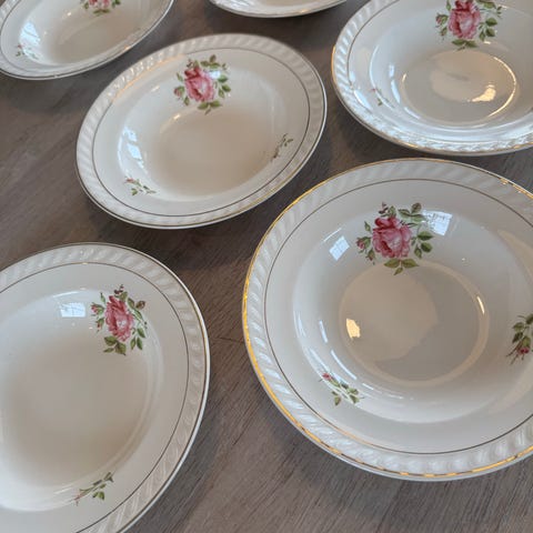 6 dype suppe-/desserttallerkener, 2 med skår.