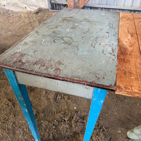 Dette er i god stand med flere bruksmerker og en fantastisk patina, noe sprekker mellom plank borplaten, helt fantastisk, se bilder.