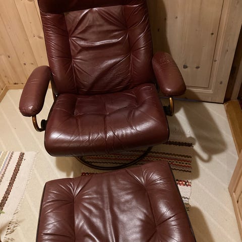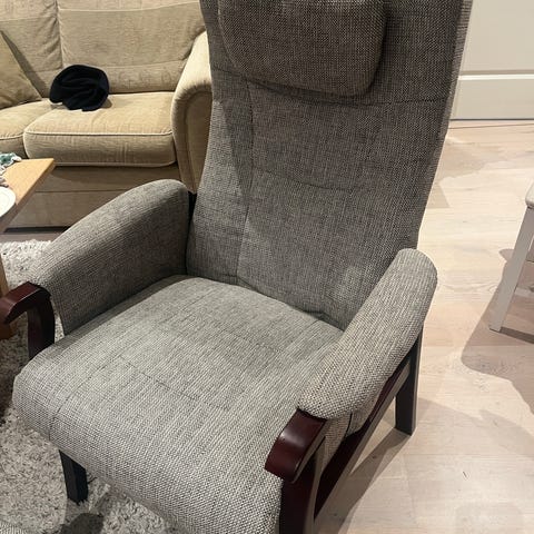 Mekanisme for tilt/vipping virker ikke, ikke no problem å bruke som vanlig. Lilla farge, stoff helt og fint, kunne sikkert hatt godt av en rens. Kom med bud Nypris 20k