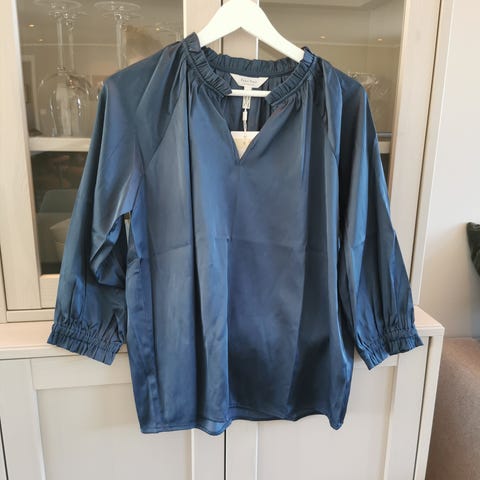 Supersøt lysblå krepptopp med halvlange ermer. Toppen er kun brukt en gang, og er størrelse M. Materiale: 54% viskose, 33% polyester, 13% polyamid. Jeg sender stort sett alltid første virkedag etter mottatt penger for frakt :)