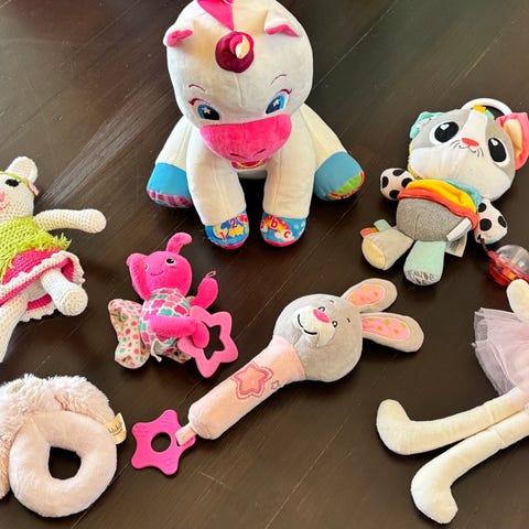 Ulike myke babyleker med rangle inni til salgs.