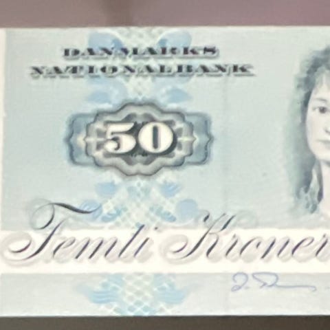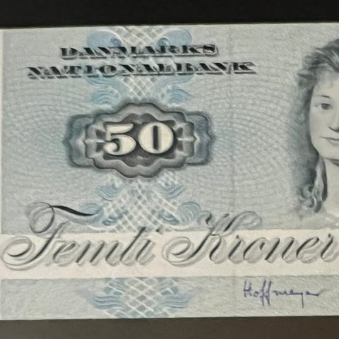 Danmarks Nationalbank 50 kroner seddel. Sedlene har påskriften «Danmarks Nationalbank» og valøren 50 kroner, med motiv av kvinneportrett på forsiden og fiskemotiv på baksiden. Egner seg som samlerobjekt eller til numismatisk bruk.