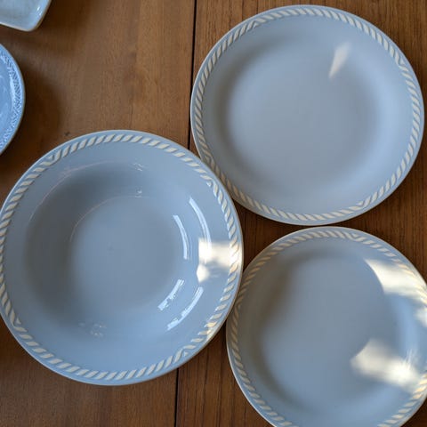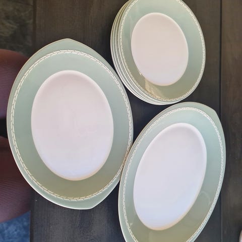 Middagstallerkener med lyseblå kant og lyst felt i midten. Dekorert med diskret mønster langs kanten. Egner seg til servering av middag eller andre måltider. Selges som sett, antall som på bildet.
