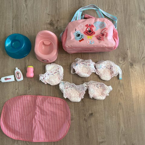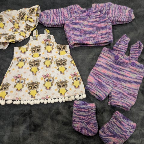Lue, sokker og votter. Hvit og rosa. Strikket i babyull. Passer til babyborn dukke eller tilsvarende. Pris 200 pr sett.