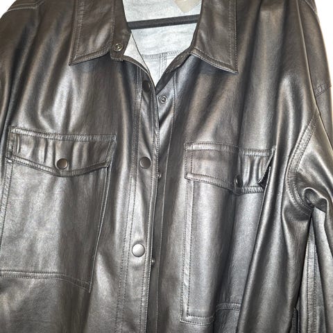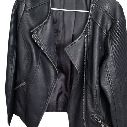 Stilig jakke med delvis stoff og skinn foran og skinn bak, 2 lommer med glidelås str L kr 300,-(5) ♻️ Vil du se flere av mine annonser? Gå inn på brukernavn i annonsen, og deretter på brukerens annonser.
