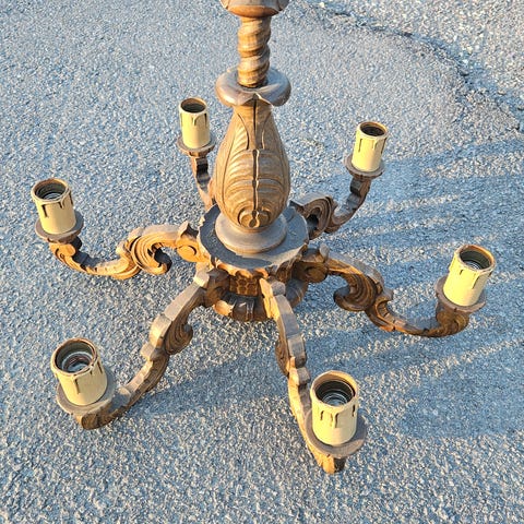 Hel og pen messinglampe til tak med 5 armer, trenger en puss da den har ligget lagret over tid, kan sendes, kjøper betaler frakt.