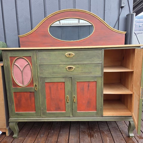 Brunt rosemalt lite skap. Skap beregnet å stå på gulv, har små ben.