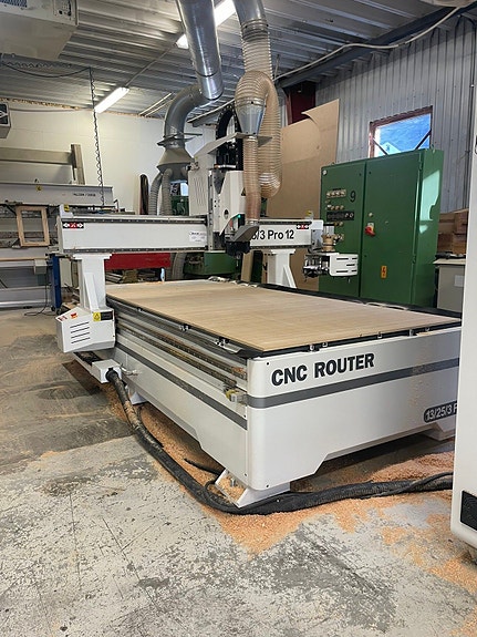 CNC 3 akse egnet for bearbeiding av trevirke og komposittmaterialer. Kraftig 9 kW spindel. Vakuumbord på 1500 x 3100 mm. Maskinen har smøresystem og verktøymagasin med 12 plasser