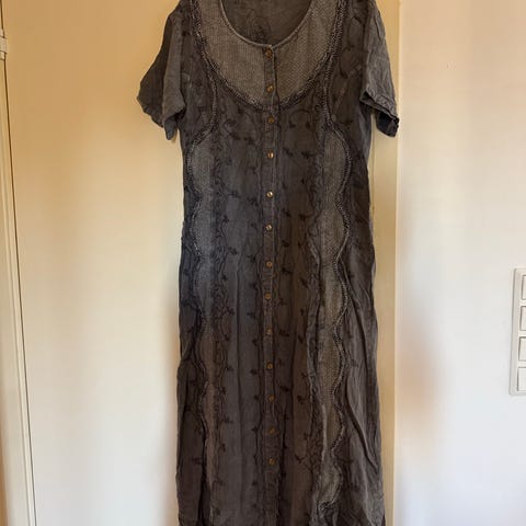 Kjole brukt 2 ganger. Litt stor i størrelsen så passer også en M. Volanger på ermene og skrå nederst på kanten. Knelengde på 160 cm.