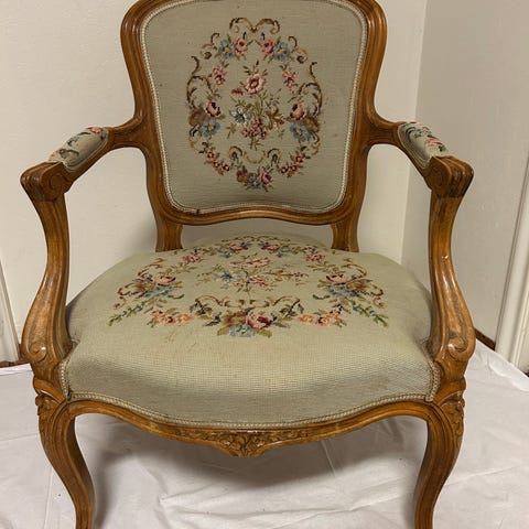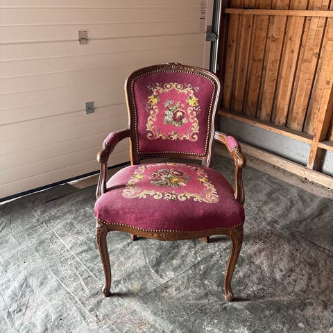 Rokokkostol brodert på 60 tallet, brukt kun til pynt. Selges kr 800.