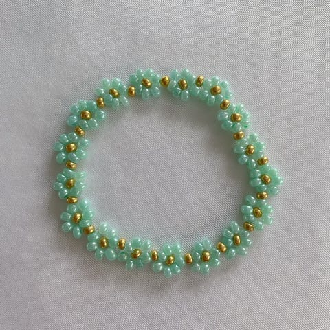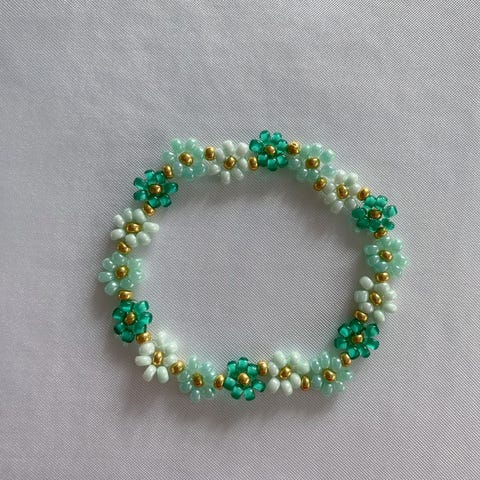 Morsomt kjede med grønne glassperler og blomst av metall. Dette er håndlaget av meg for noen år siden, men aldri brukt. Du får med en søt, liten smykkepose til å ha det i også. Selges for kr 150