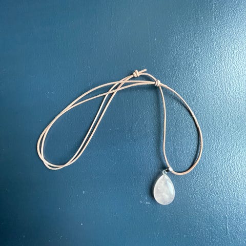 Langt, spesielt halskjede bestående av mange elementer. Mange rader med små glassperler i hvitt og grått, samt metallenker m.m. Litt usikker på hva anhenget er laget av, enten stein, eller glass, tror jeg. Selges for kr 100.