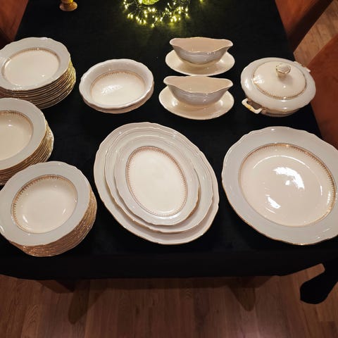 6 kopp m/ skål, 6 asjetter 18 cm, 6 tallerkener 21 cm, 6 eggeglass. 1 stor mugge 1 fløtemugge, 1 lite fat. Sukkerskål m/ lokk og en syltetøyskål. Aldri vasket i oppvaskmaskin. Ikke brukt siste 24 år. Noe svak krakelering på noen få ting, imens resten fremstår som i meget god stand. Selges helst samlet, hbo 5000,-.