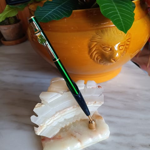 Kulepennen er tom for blekk, men ellers hel og pen👍