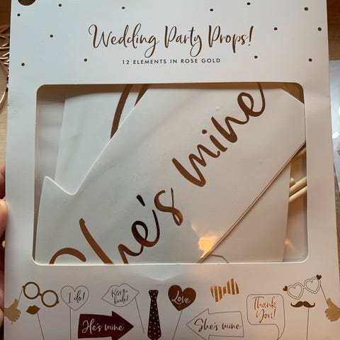 Photo props, hælbeskyttere, stillettbeskyttere (3 størrelser for ulik tykkelse på stillett, 2 farger), I do - ringboks, og skilt i kartong Mrs og Ms.