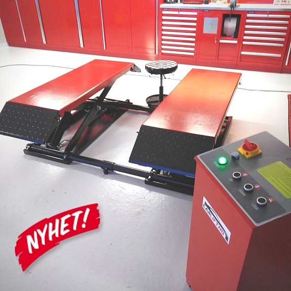 Høyt løftene sakseløfter, men fortsatt lavtbyggende med sine 105mm sammenlagt. Kraftig oppbygning med 2 separate sakser, utstyrt med 2 sylindere pr.saks. Bukken gir god tilgang under bilen. Leveres komplett med alt som trengs utenom hydraulikkolje.