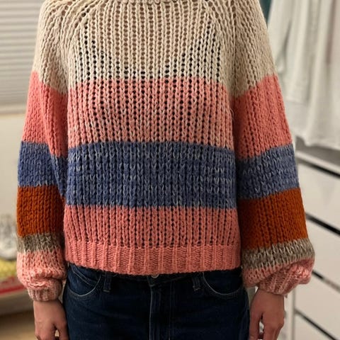 Kull genser i stilig fasong. Nydelig rød farge. Mykt stoff i bomullsblanding (se siste bilde for beskrivelse). Str one size, passer best XS/S.