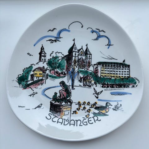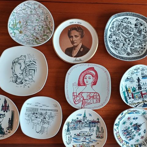 Samling av platter D:21 cm fra Stavangerflint utgitt i samarbeid Norske Kvinners Sanitetsforening. Forskjellige motiver tegnet av Fredrik Matheson (1908-1999). Sannsynligvis produsert på 60-tallet før Stavangerflint fusjonerte med Figgjo Fajanse