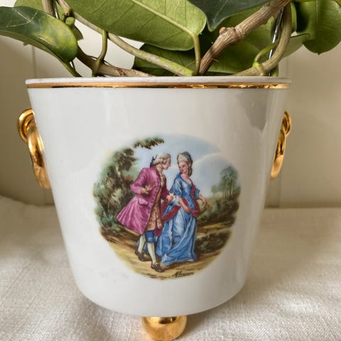 Flott, vintage potteskjuler (cache pot) i porselen fra Freiberger Porzellan, dekorert med et klassisk motiv av et elskende par fra det 18. århundre.