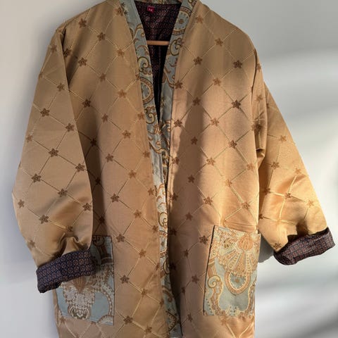 Som ny, egentlig 40-42 vil jeg si. Lang silkejakke sydd av en skredder i Thailand for noen år tilbake. Jeg har blitt for stor for dette nydelige plagget.