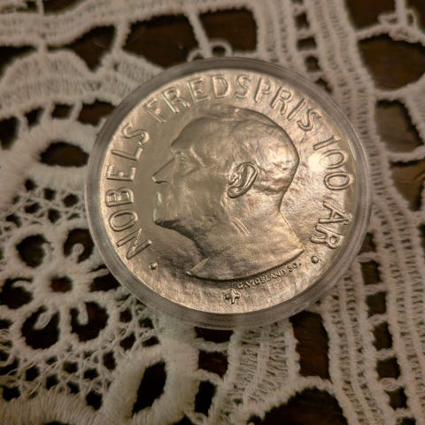 Selger boken som ble gitt ut ifm 100 års jubileet til Nobels Fredspris. Se bilder. Knap vært åpnet.