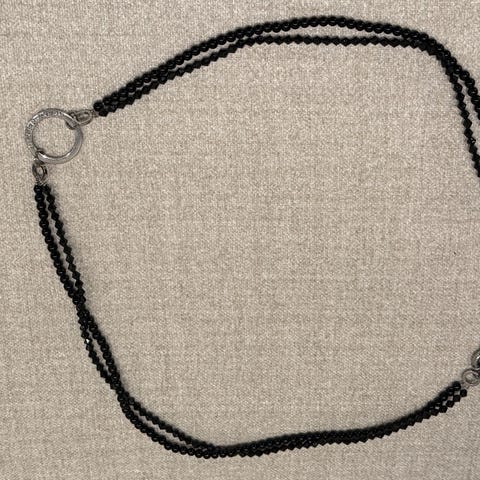 Veldig fint, pent brukt, og anvendelig dobbelt kjede/smykke med stor, svart kule med stor krystall på toppen.