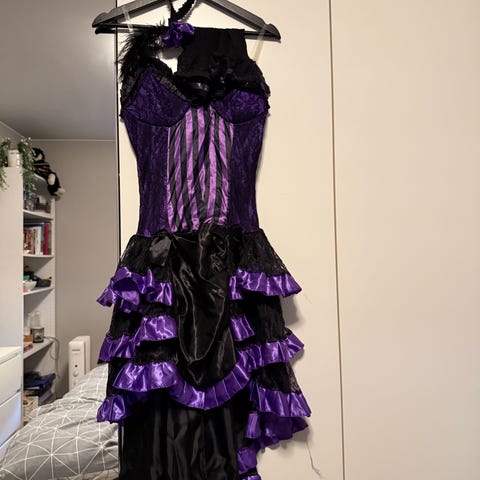 Kjempefin kjole til fest eller Halloween! Nydelig dyp rød med sort underskjørt og dekorative sløyfer, glidelås i god stand i ryggen og sort pyntebånd som kan knytes foran eller bak.