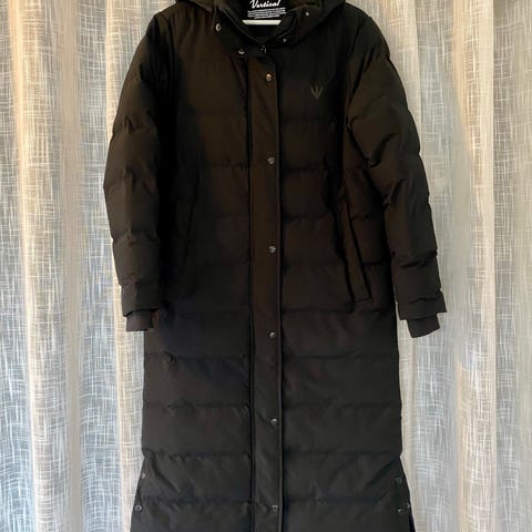 Damejakke i svart farge i størrelse L. Jakken er en knelang modell med belte i livet og flere lommer foran. Den har høy krage, hette med pelskant og fine corddetaljer. Glidelås og knappelukking foran. Passer som ytterjakke i kjøligere vær. Fôret i 50% dun og 50% fjær.