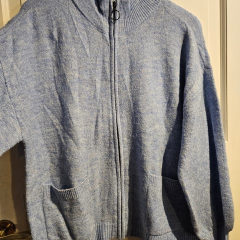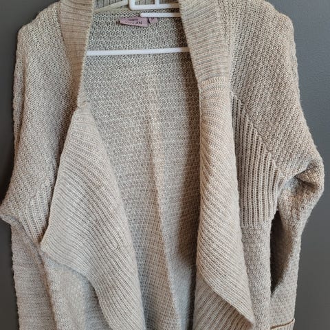 Rå strikkajakke fra Selected Femme, str XS. Oversized så passer også S. Lang modell med rund hals og stikklommer. Blanding av akryl, nylon, ull og mohair. Kun brukt 2-3 ganger, fremstår som ny.