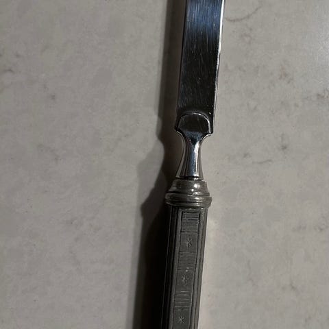 Krepsekniver 12 stk,meget spesielle og skjeldne. Svensk/plett /nysølv. 14 cm lange.Selges helst samlet men kan deles i 6+6. 600 kr eller bud,men ikke skambud,da,vær så snill!