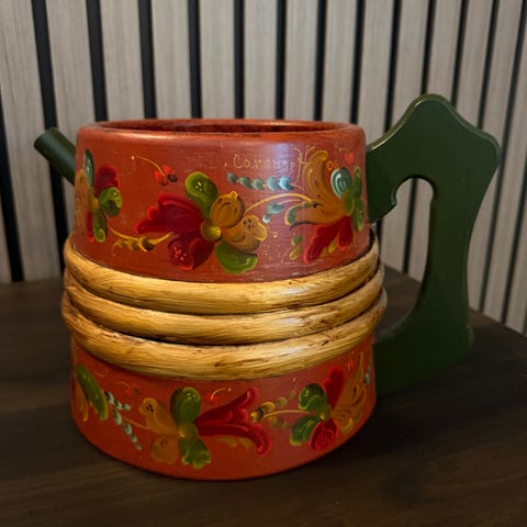 Selger en flott rosemalt kanne i tre, med lokk som kan åpnes! Den er vakker, og har ingen skader! Høyden er ca. 56 cm. Den selges for under halv pris! Pluss frakt, men den bør helst hentes! Gi bud! 😀 zKjøpt for over 2000kr!