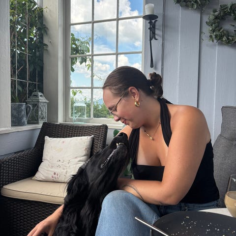 Inne er hun rolig og sover. Hun sover mye på sofaen her og kan snike seg opp i en seng, så jeg låser soverommene når jeg er på jobb. Noen ganger er hun i bilen en dag mens jeg er på jobb.