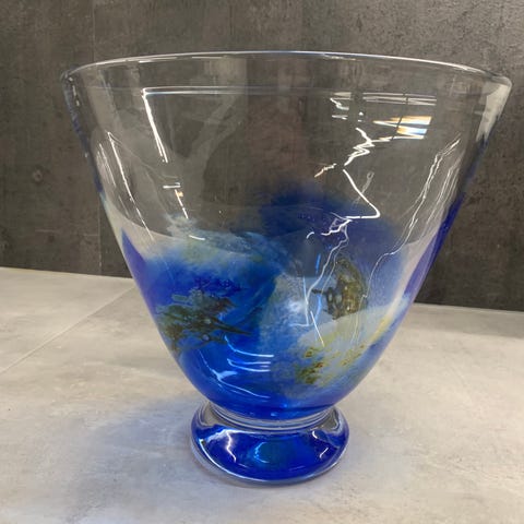 Glassbolle med rosa, blå og grønn dekor, D20,3 øverst, stett ca 11 cm diameter? H16 cm. Vekt 817 gr