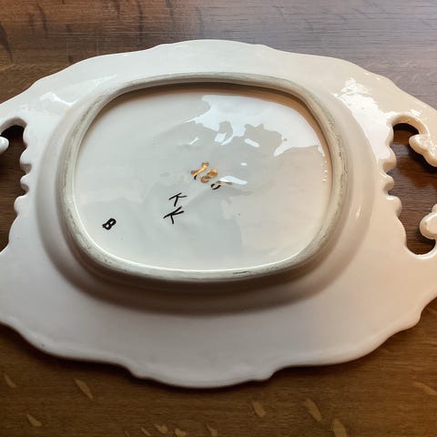 Dekorativ eldre signert keramikk fat fra Kråkerøy Keramikk. Ingen hakk, skår, lite slitasje i gull kanten en plass, se bildet.
