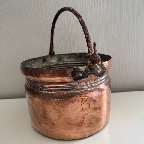 Liten bøtte i kobber m/hank, selges kr 280,-