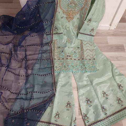 Selger pent brukt pakistansk kjole med trouser og dupatta til rimelig pris. Er brukt kun en gang på et bryllup for 2 år siden. Selges på grunn av at de ikke lenger passer. Ikke noe skade eller merker.