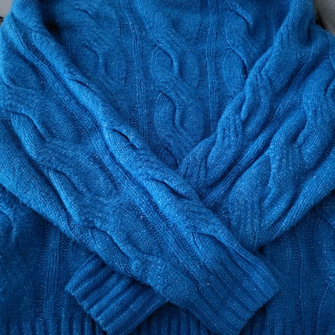 Lekker høyhalset genser med fletter, marineblå bomull str. 38/40 - det står L