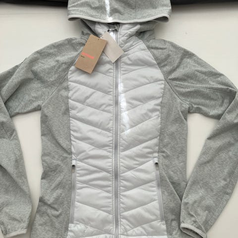 Vatterte partier foran og bak. Tommelhull. Lengre bak for bedre passform i bevegelighet. Lommer foran med glidelås. Delvis fôret. Selges billig da jakken har en liten skade (se bilder).