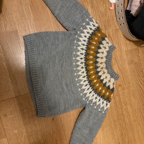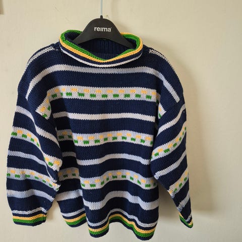 Hjemmestrikket bomullsgenser med søt krone på, bare brukt en gang