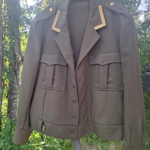 Jakke med sersjantdistinksjoner, brukt i 1950-årene, med MP (miliærpolitimerke) og fløyte. Fra krage til bunn er det (ca) 56 cm, bredde ca 50, og ermene 62 cm. Med uniformslue, noen skader foran. Gi bud.