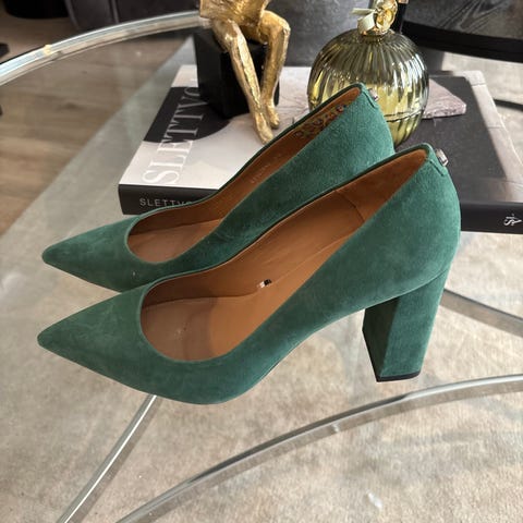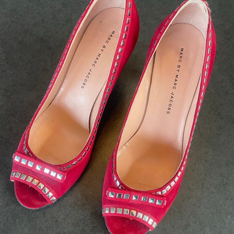 Selger med tungt hjerte disse lekre høyhælte pumps’ene fra Marc Jacobs da ryggen dessverre ikke er noe glad i høye hæler lenger. De er svært lite brukt og fremstår som nye. Grått semsket skinn, med en helt unik hæl. Str 40, og normal i størrelsen.