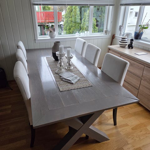 Bordet er i en nydelig gråfarge hvor trestrukturen sees gjennom.