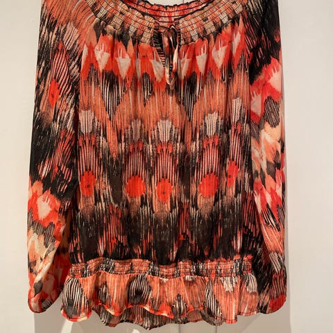 Lett og luftig bluse m/‘flaggermusermer’! Kun prøvd på en gang, fargen passet ikke meg. Oransje/svart. Str ca. 42/44. Hentes/sendes med posten. Betaling Vipps/kontant. Se bilder!! 🌟🌟🌟