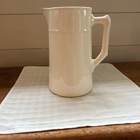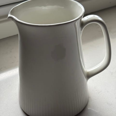 Lite mugge /fløtemugge fra Eigersund flint. Litt fargeforskjell i «godset». Se bildet-ikke godt å se. Høyde 15cm Rommer 5dl. Samlerobjekt. Selges grunnet flytting