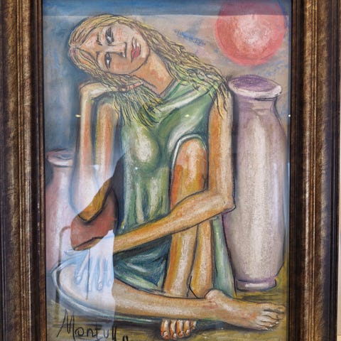 Maleri av tom k j kunstner som viser en sittende kvinne som holder en bolle. Bildet er utført i varme fargetoner med innslag av hvitt og blått i tekstilen rundt figuren. Motivet er stilisert og malt i en løs, ekspressiv teknikk. Egner seg som veggdekor i for eksempel stue, soverom eller gang. mål 40*50 cm .på plate