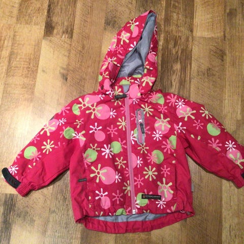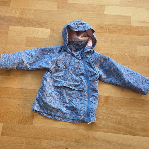 Pent brukt jakke fra name it. Brukt av ett barn. Avtagbar hette. Åpen lomme foran. Strikk rundt håndledd som hindrer vind å komme oppover armene. Sommerfugler. Ikke røyk/dyr.