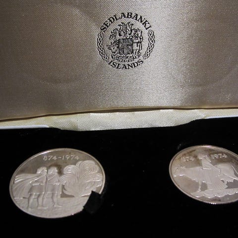 1994: 3X SILVER PROOF ICELAND - REPUBLIC OF ICELAND 50TH ANNIVERSARY The Central Bank of Iceland issued 3 commemorative coins to celebrate the 50th anniversary of the republic. Each coin bears the profile portrait of one of the three former Presidents of Iceland. Mr. Sveinn Bjornsson (1944 - 52), Mr. Asgeir Asgeirsson (1952 - 68) and Mr. Kristian Eldjarn (1968 - 80). The obverse show the Icelandic coat of Arms. SPECIFICATION: Year: 1994 Design obverse/reverse: Mr. Throstur Magnusson Purity: 925/1000 silver Quality: Proof Weight: 30 grammes Diameter: 39 millimeters COA: Yes Issue: 3000 proof sets